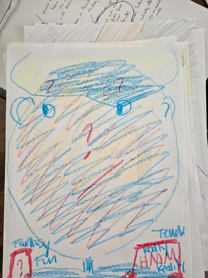 Therapists looking to highlight clinical themes in exercises like this might notice the following. First, there is a discrepancy between self-image and public persona in the portraits. One client, whose works aren't pictured here, offered an image of her face surrounded by hearts. The second image, however, was a split canvas with one whole-body representation of herself residing in a box. In that version of herself, her heart was broken in her chest and a frowning, disembodied facial expression floated outside of her facial area. I commented, "it looks like it takes a lot of energy to come across as so loving all the time." She replied, "It's exhausting. And I have to keep my sadness locked away." Clearly, the client suffers distress any time she wants to fulfill her own emotional needs.